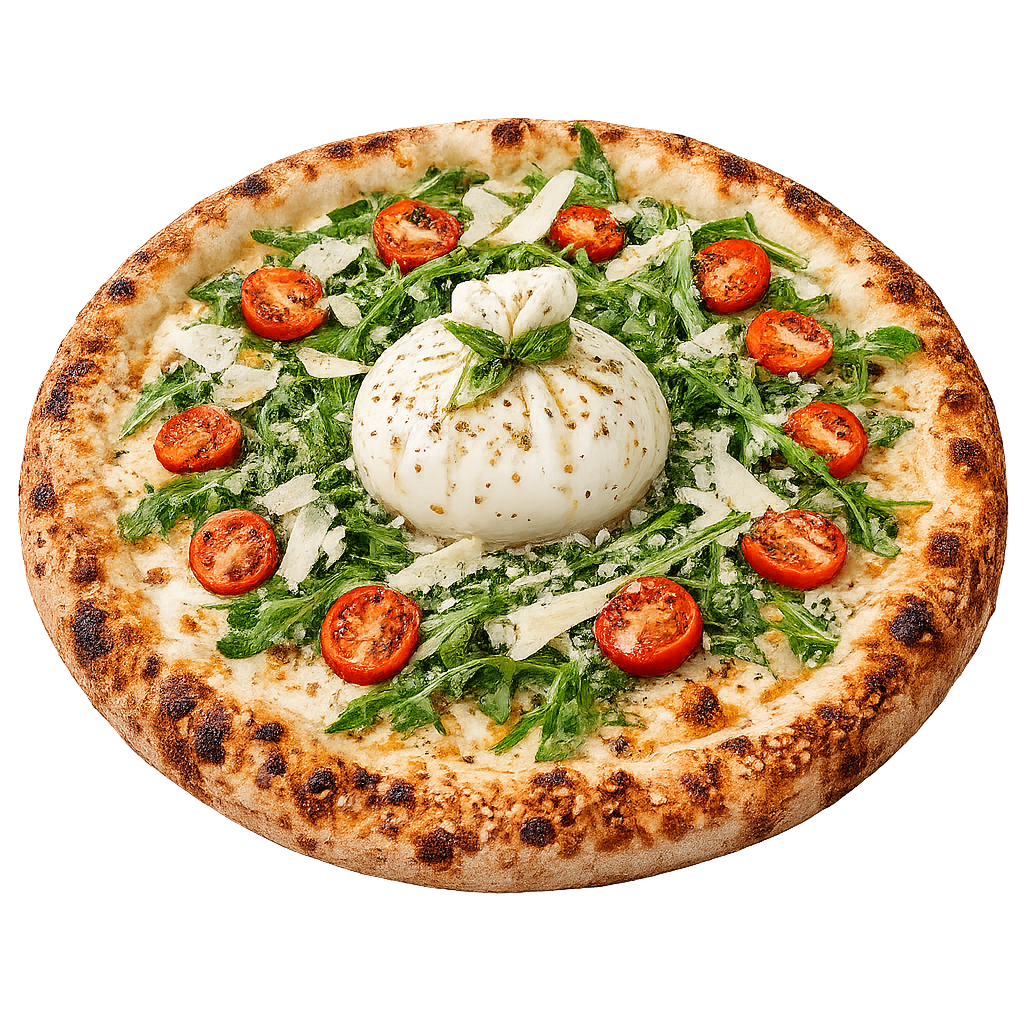 Mit Käse, Cherrytomaten, Rucola, Käseflocken und Burrata